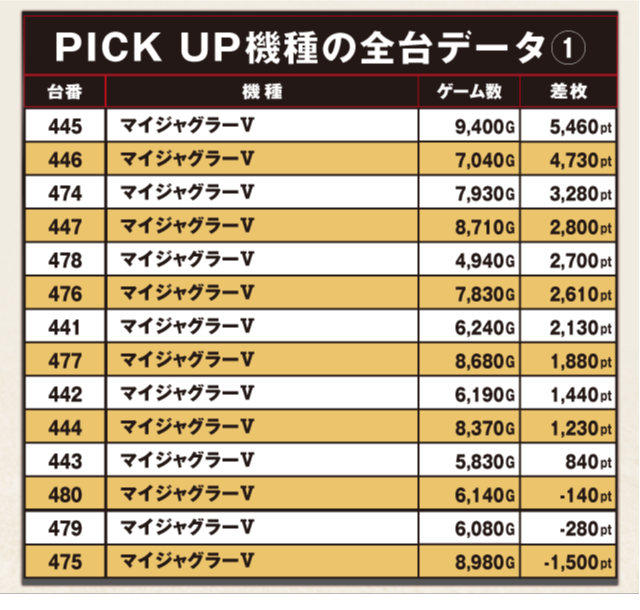 『マイジャグラーⅤ』は+5,460ptを記録した445番台以外にも多数の好調台を確認。最終的に全14台中11台がプラス差枚となる見事な結果を残している。