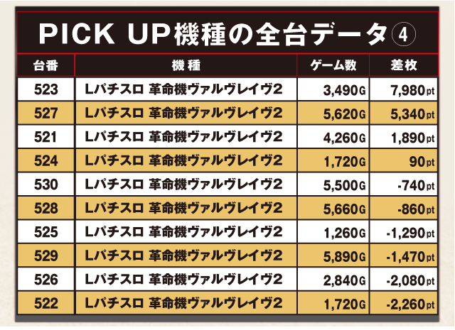 差枚ランキングを制した『パチスロ 革命機ヴァルヴレイヴ2』は、523番台以外に527番台が5,340ptを記録しており、シマ内は常に活気に満ち溢れる一日となった。