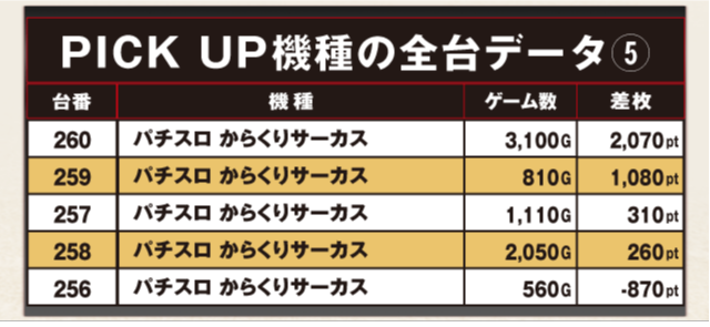 『パチスロ からくりサーカス』は260番台の+2,070ptを皮切りに全5台中4台がプラス差枚に。唯一プラス域に届かなかった台のマイナスもわずかなものであった。