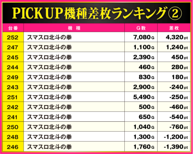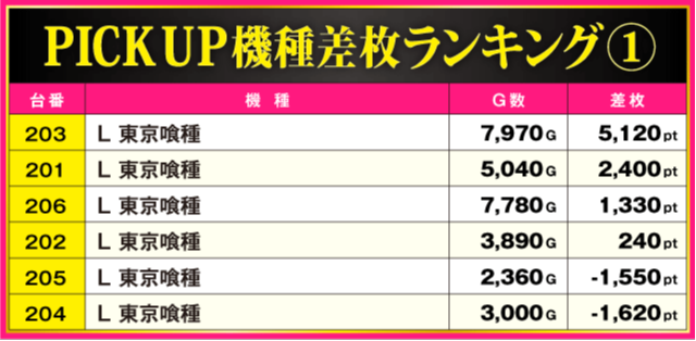 今回のPICK UP機種は全3機種。『L 東京喰種』は+5,120ptを筆頭に全6台中4台がプラス差枚となる見事な結果を残した。また、『スマスロ北斗の拳』からは+4,320ptが発生。さらに、バラエティコーナーの『麻雀格闘倶楽部 覚醒』もしっかりとプラス差枚で実戦を終えている。