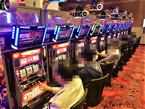 「バジリスク~甲賀忍法帖~絆」や「ミリオンゴッド-神々の凱旋-」、ジャグラーシリーズなども注目されており、各シマからにぎやかなムードが伝わってきた。