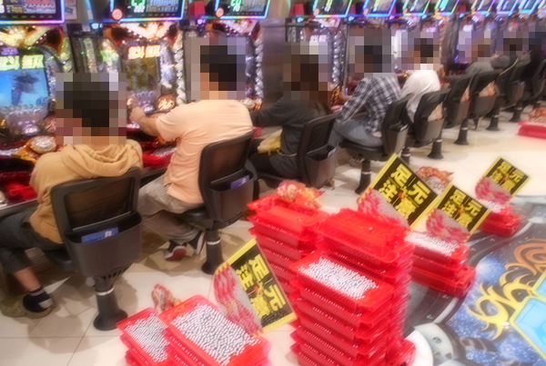 1円パチンコと5円パチスロのどちらも大勢のプレイヤーでにぎわっており、空き台が見当たらないほどの人気となっていた。