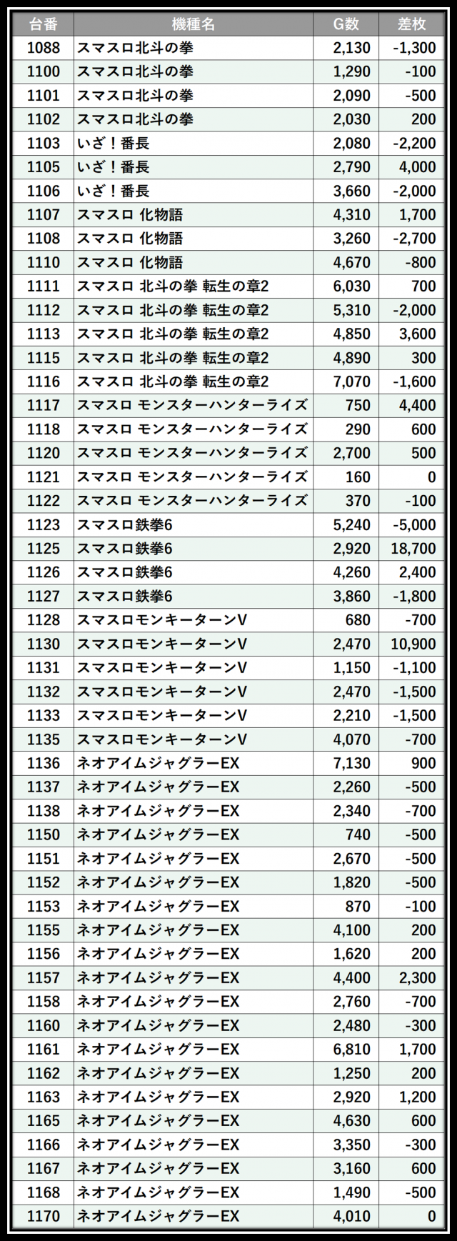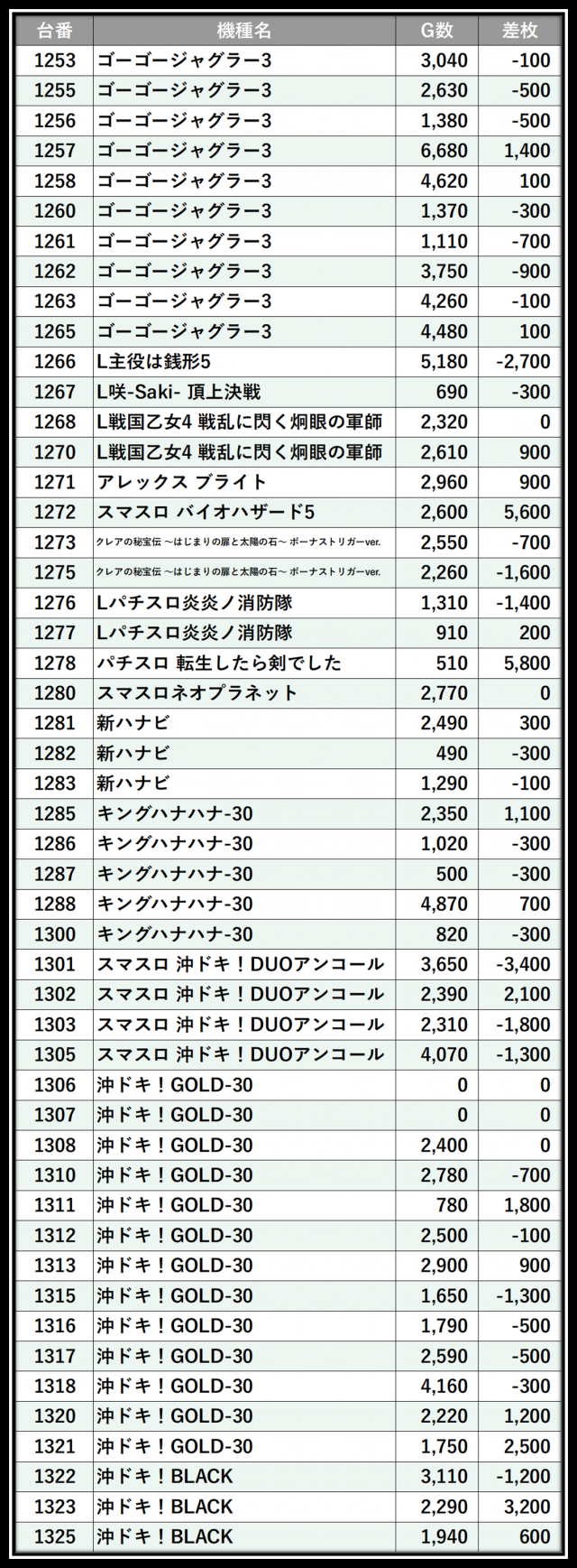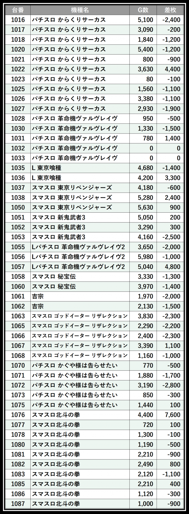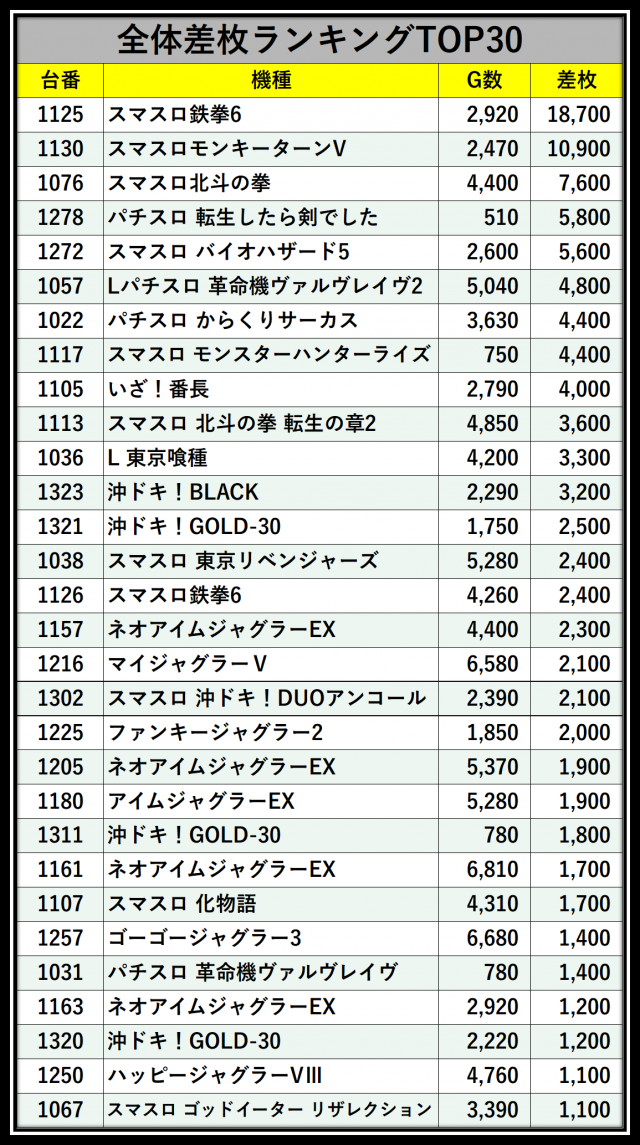 ※差枚数順に掲載しています