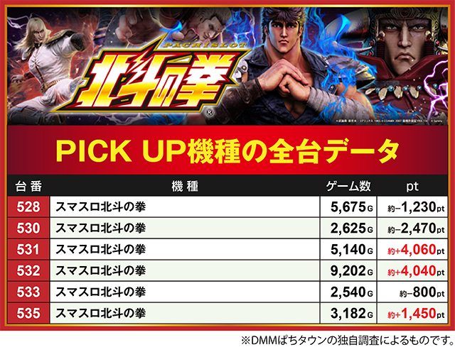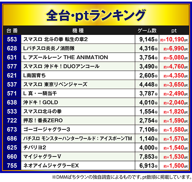 「スマスロ北斗の拳」の513番台と532番台も約+4,000pt以上となった。