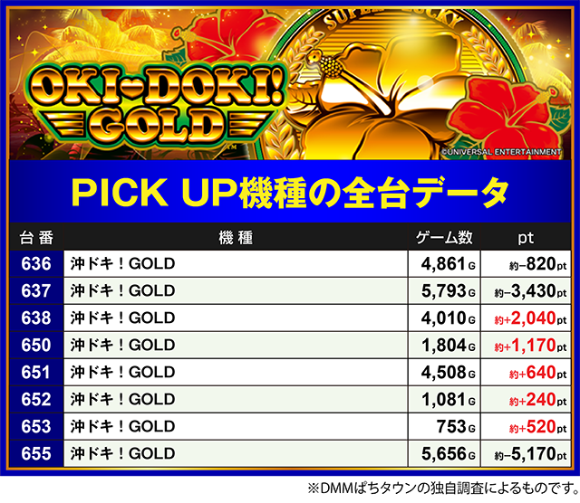 「沖ドキ!GOLD」では、638番台が約+2,000ptオーバー。