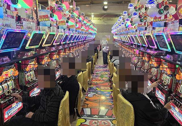 「マイジャグラーⅤ」の複数台で華やかなシーンをキャッチ!!