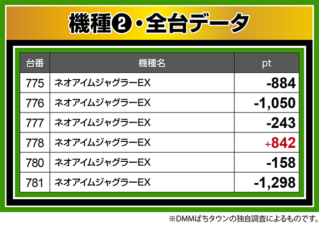 『ネオアイムジャグラーEX』も輝きを感じられた機種のひとつ、778番台が結果を残した。