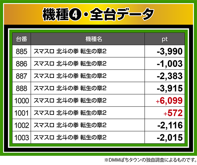 最新機種である『スマスロ 北斗の拳 転生の章2』でも、1000番台が+6,000ptを上回った。
