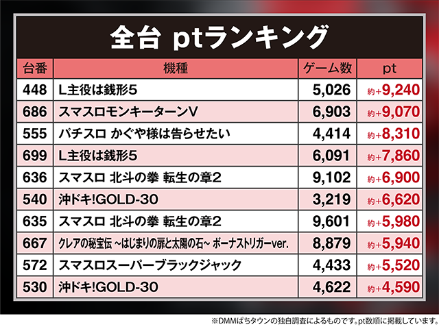 「パチスロ かぐや様は告らせたい」の555番台は約+8,300ptを超え、「スマスロ 北斗の拳 転生の章2」の636番台も約+6,900pt以上となった。