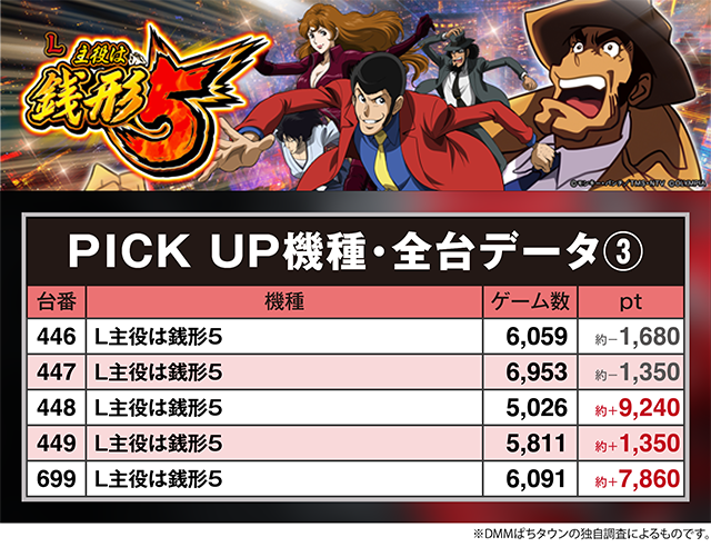「L主役は銭形5」では、448番台が約+9,200ptオーバー。