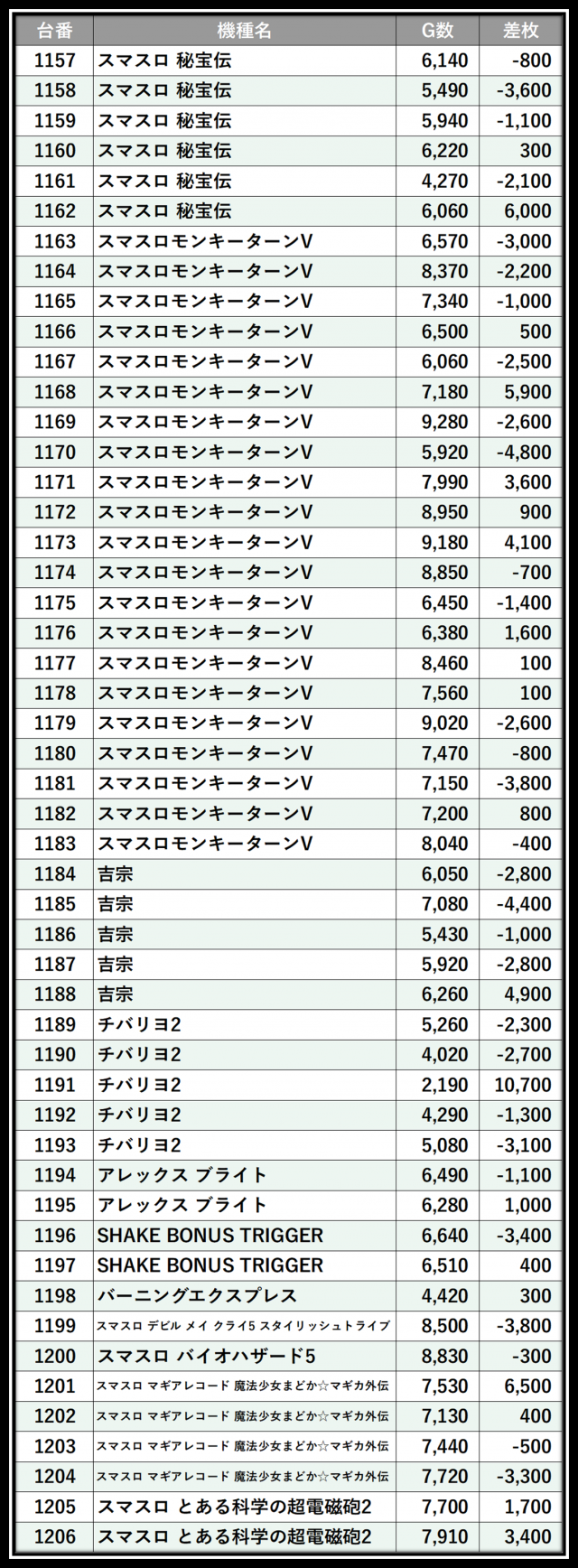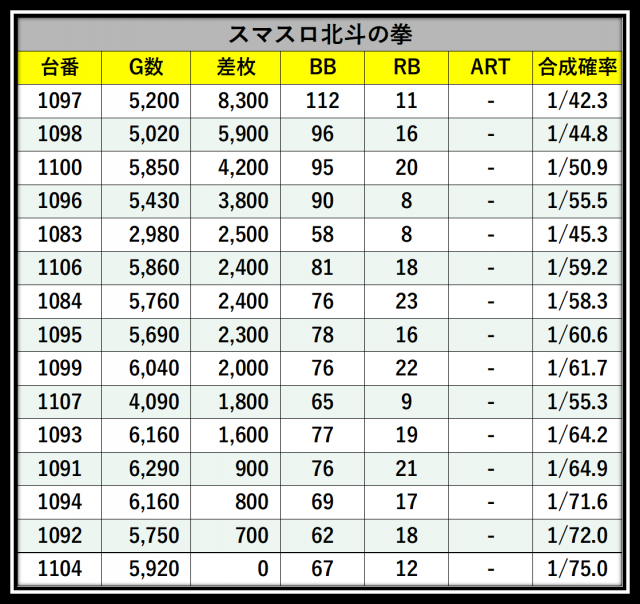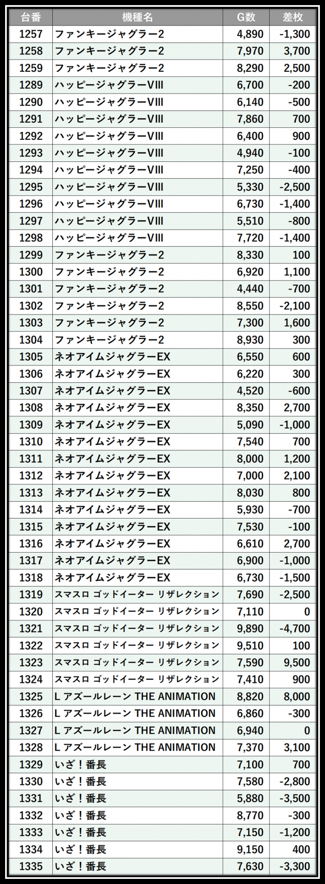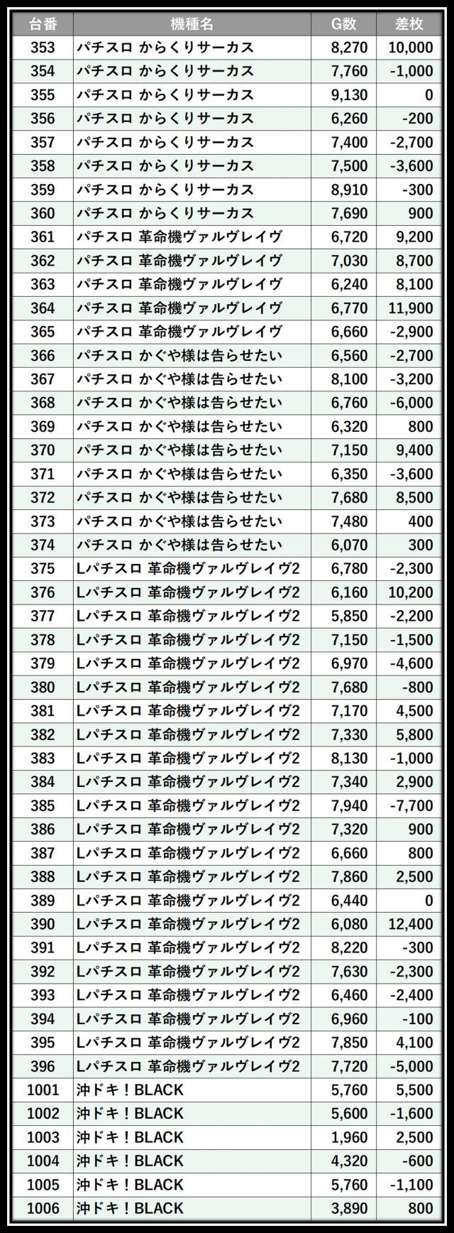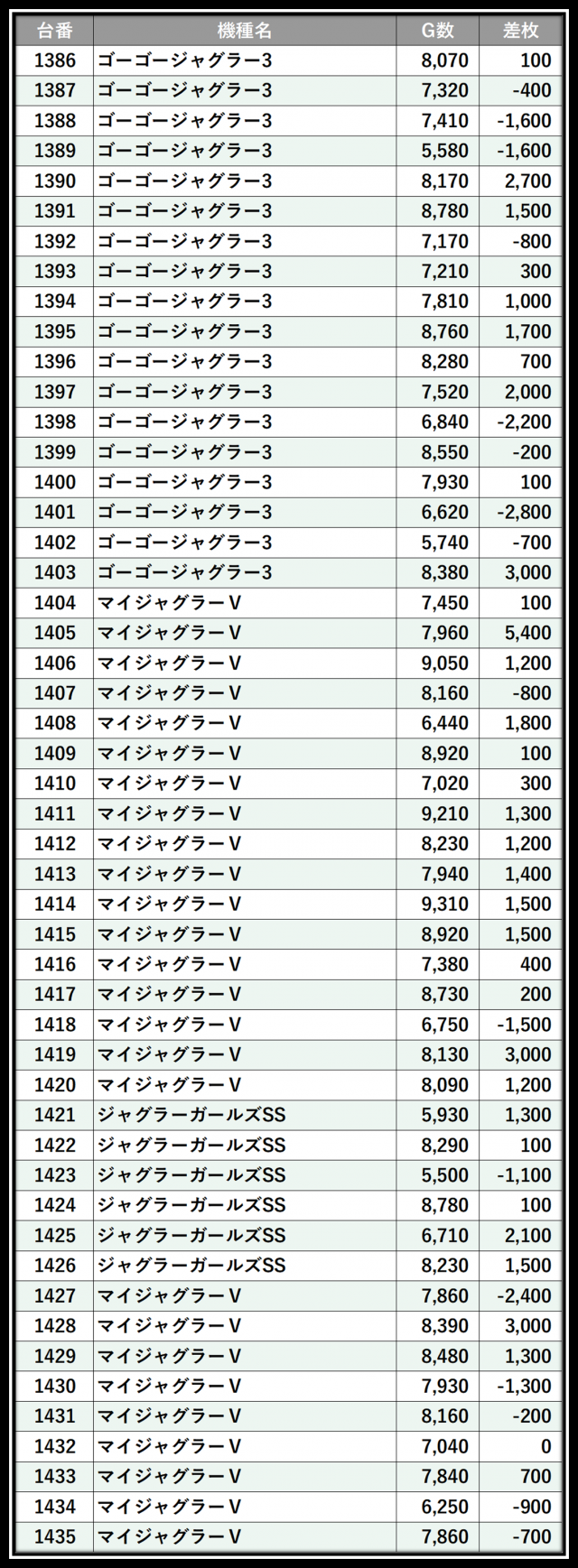 ※差枚数順に掲載しています