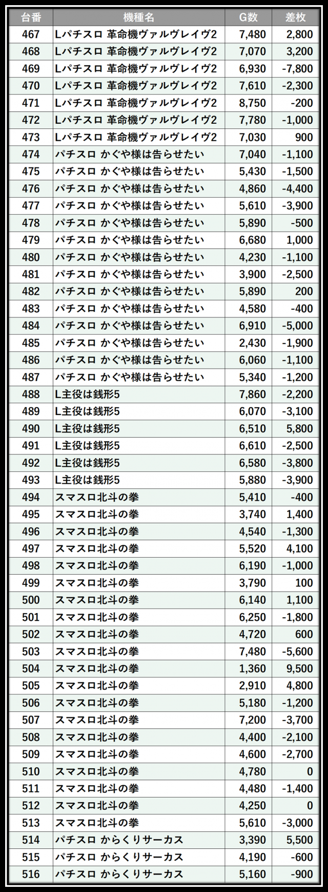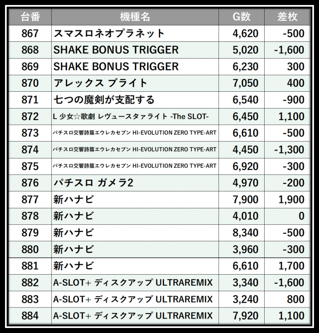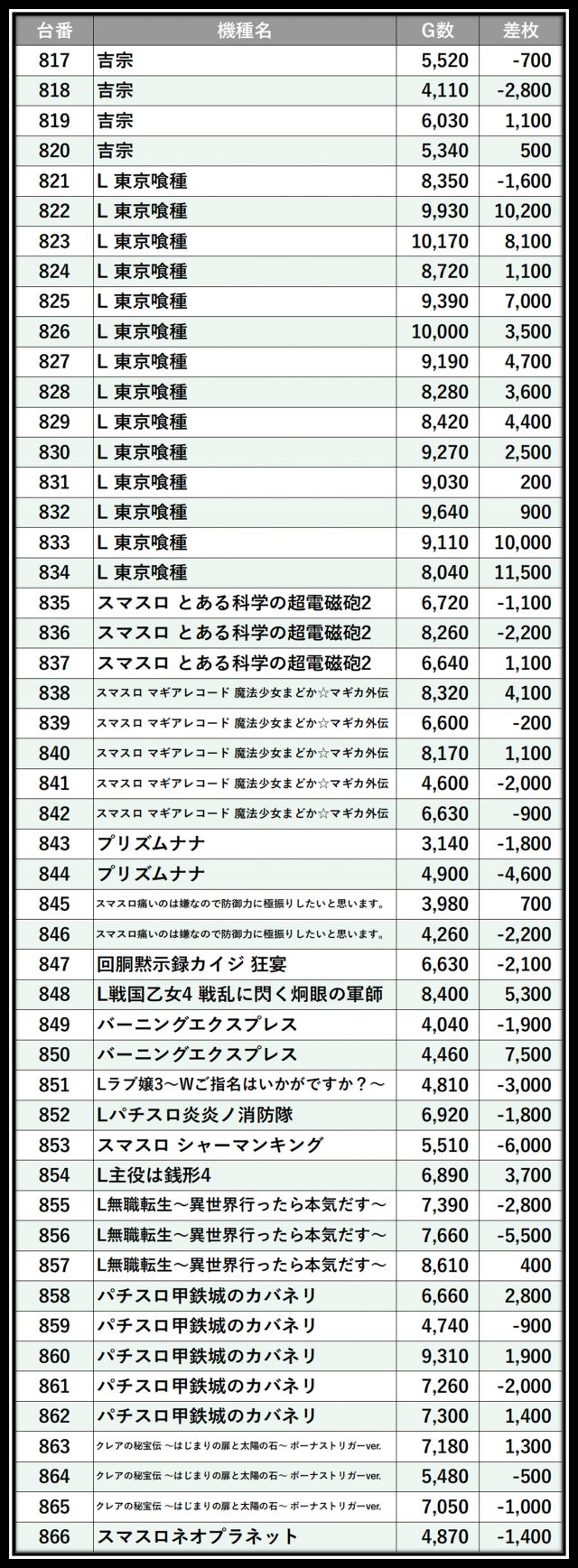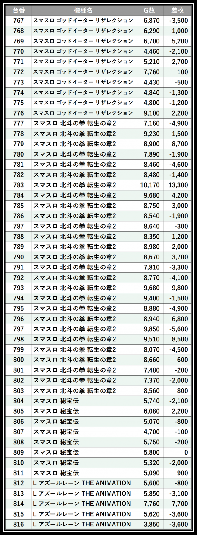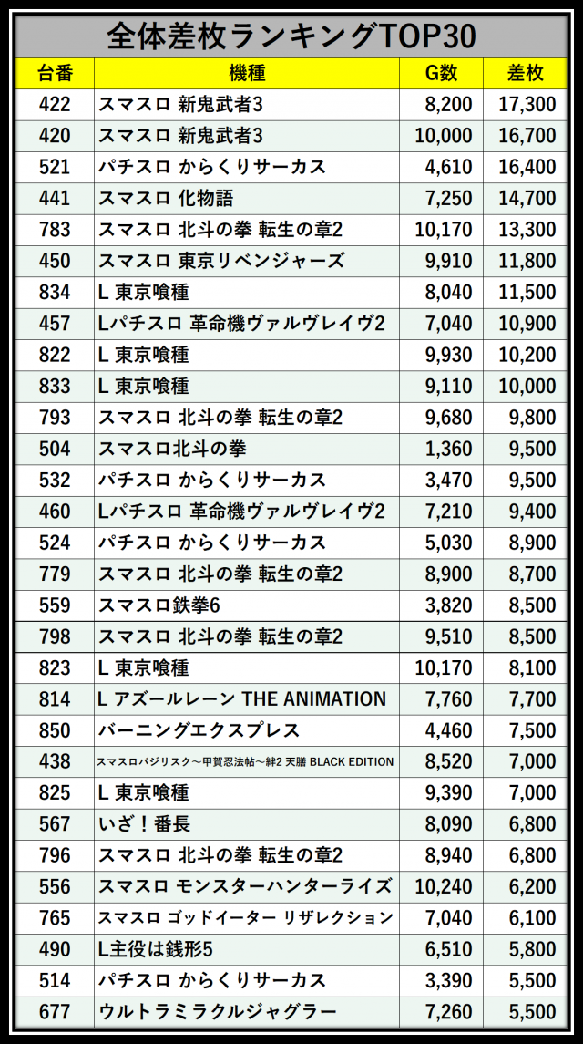 ※差枚数順に掲載しています