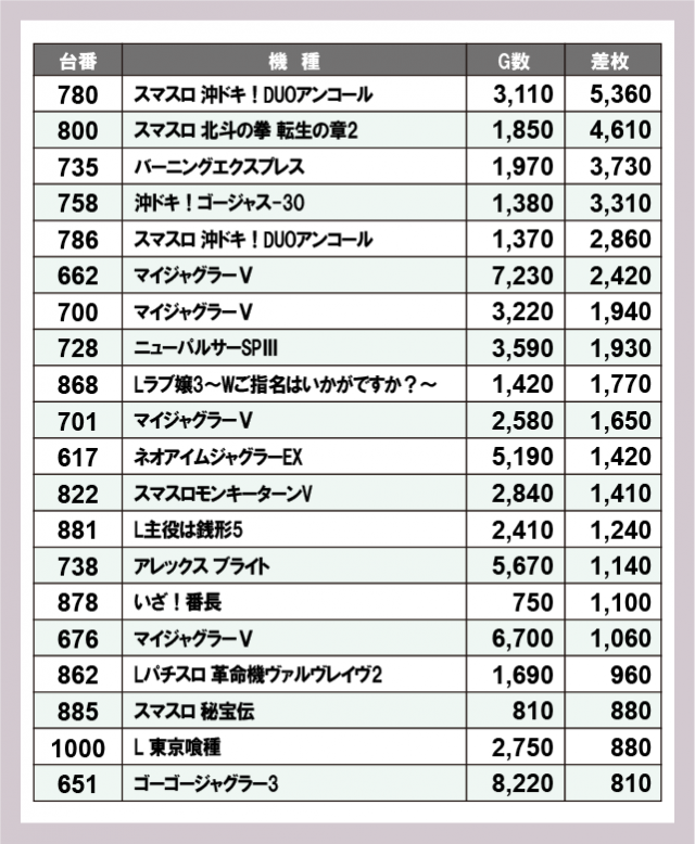 ※差枚数順に掲載しています