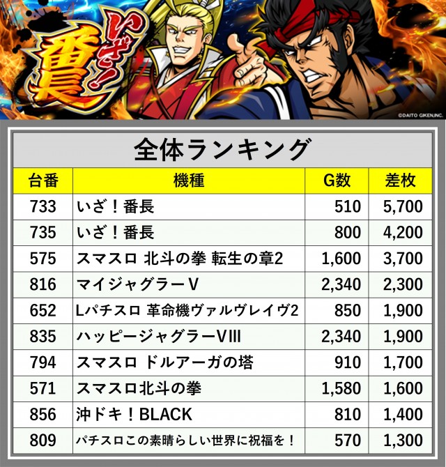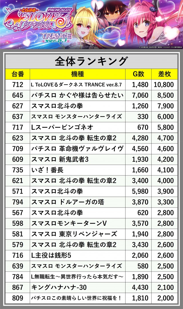 ※差枚数順に掲載しています
