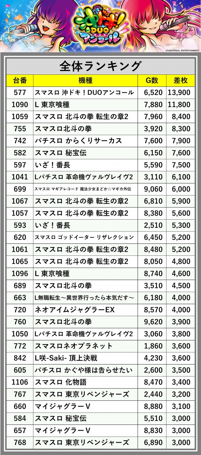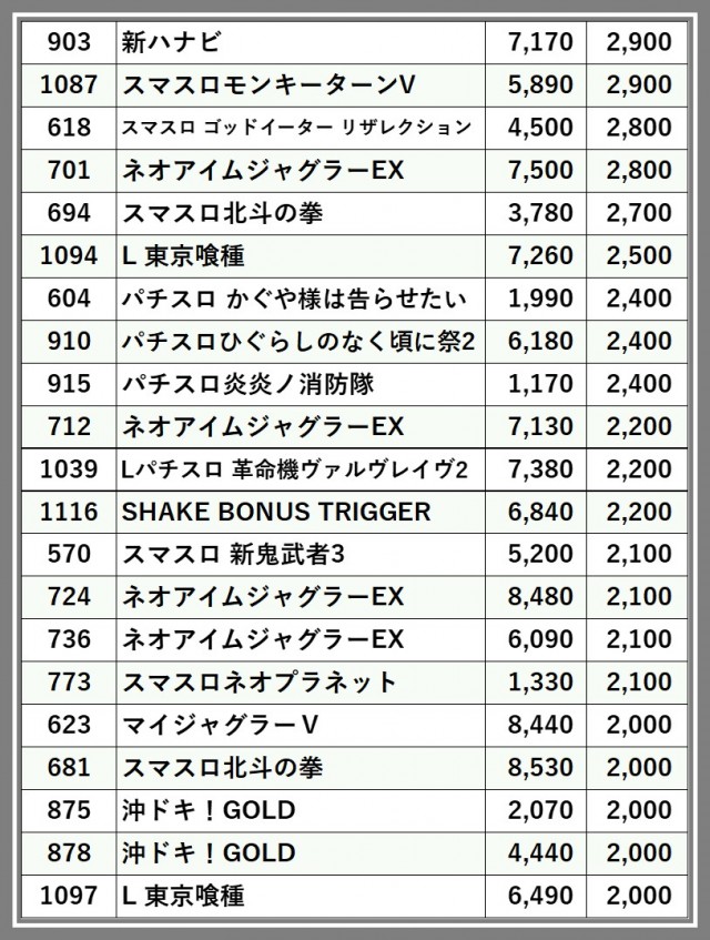 ※差枚数順に掲載しています