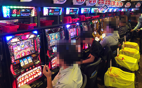 16時頃の21.27円パチスロをみると、「押忍!番長3」や「バジリスク~甲賀忍法帖~絆」が大盛況。シマ全体に華やかな光景が広がっていた。