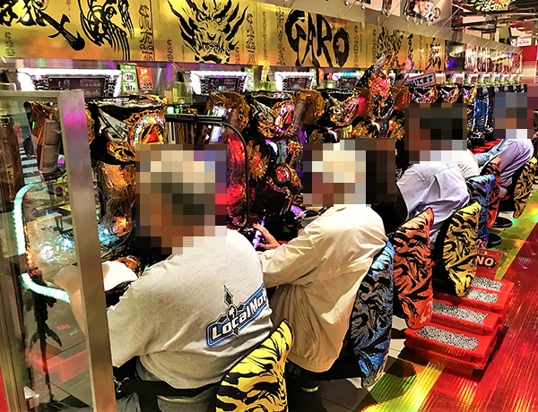 14時を過ぎた頃の4円パチンコでは、「CR牙狼GOLDSTORM翔」がとくに人気。機種の魅力を堪能しているようなプレイヤーの明るい表情が印象的であった。
