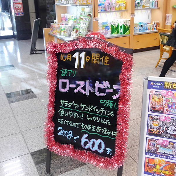 景品コーナーは食料品から日用品まで充実の品揃え。この日はローストビーフの提供の予告が出され、多くのプレイヤーが興味をそそられているようだった。