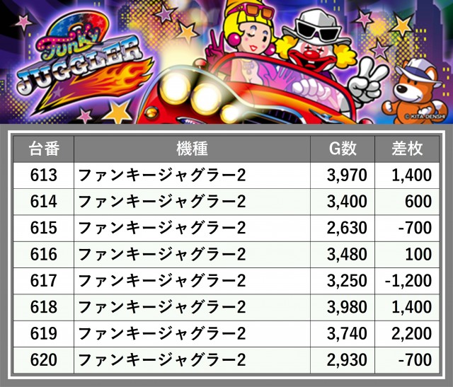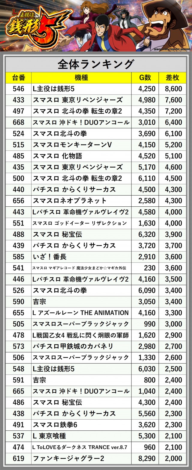 厳選された取材対象機種をはじめ、その他スロット全体から好記録が飛び出した!プレイヤーが楽しんだ1日を下記データにて振り返ってみて欲しい。