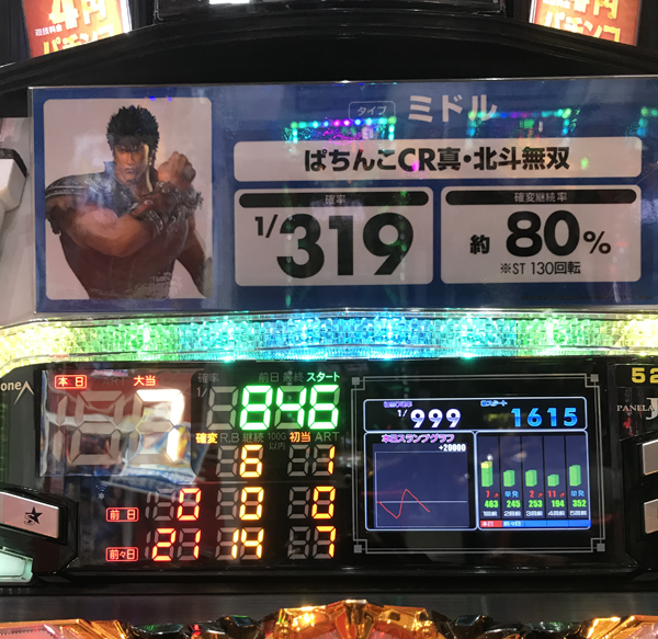 設置台数が多い「ぱちんこCR真・北斗無双」のなかで、過去最高大当り回数が33回のカド台を実戦場所に選択。