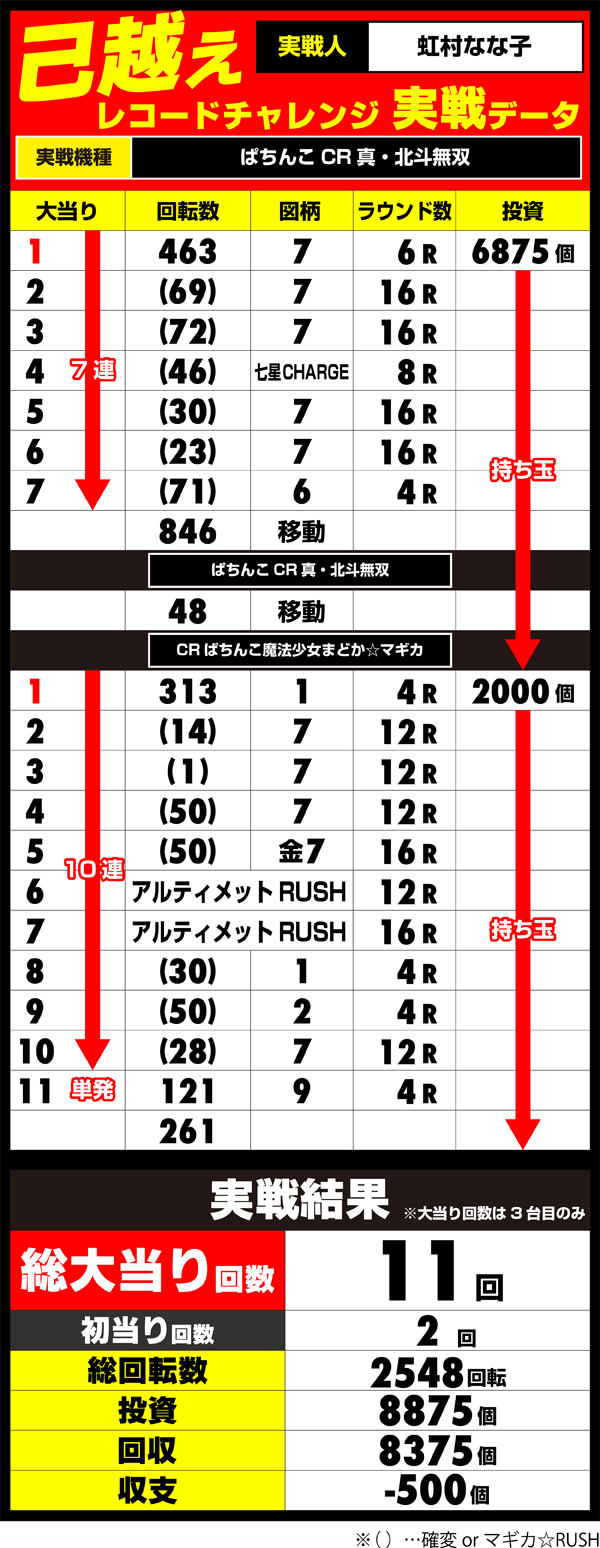 いきなり10連チャンといったハイペースをみせるも、過去最高記録には届かずにチャレンジ終了となった。