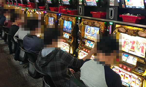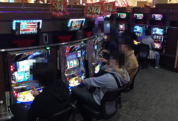 朝イチのパチスロをみると、「押忍!番長3」や「バジリスク~甲賀忍法帖~絆」、「押忍!サラリーマン番長」などが満席。
