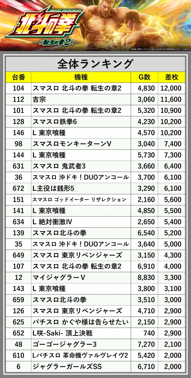 厳選された取材対象機種をはじめ、その他スロット全体から好記録が飛び出した!プレイヤーが楽しんだ1日を下記データにて振り返ってみて欲しい。