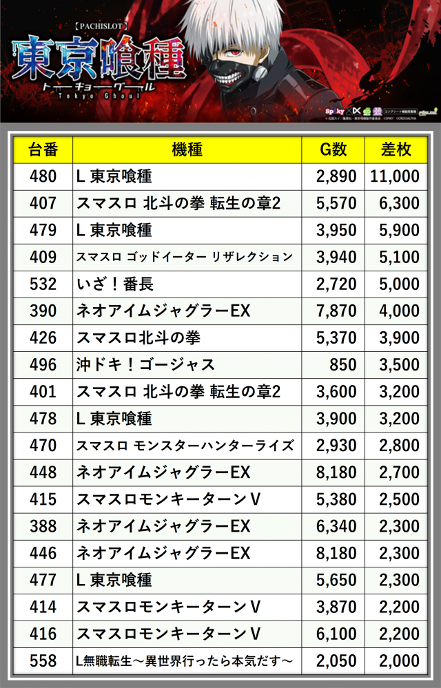 厳選された取材対象機種をはじめ、その他スロット全体から好記録が飛び出した!プレイヤーが楽しんだ1日を下記データにて振り返ってみて欲しい。