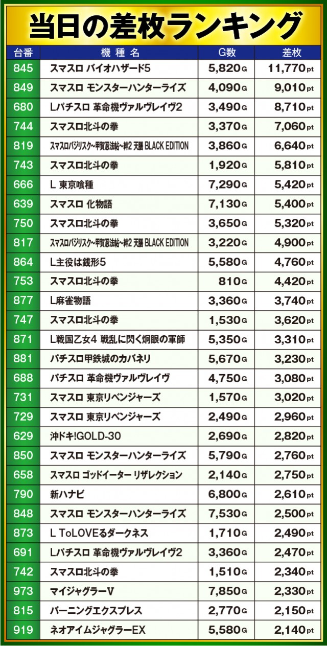 ※差枚数順に掲載しています