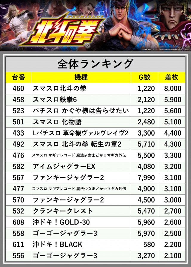 厳選された取材対象機種をはじめ、その他スロット全体から好記録が飛び出した!プレイヤーが楽しんだ1日を下記データにて振り返ってみて欲しい。