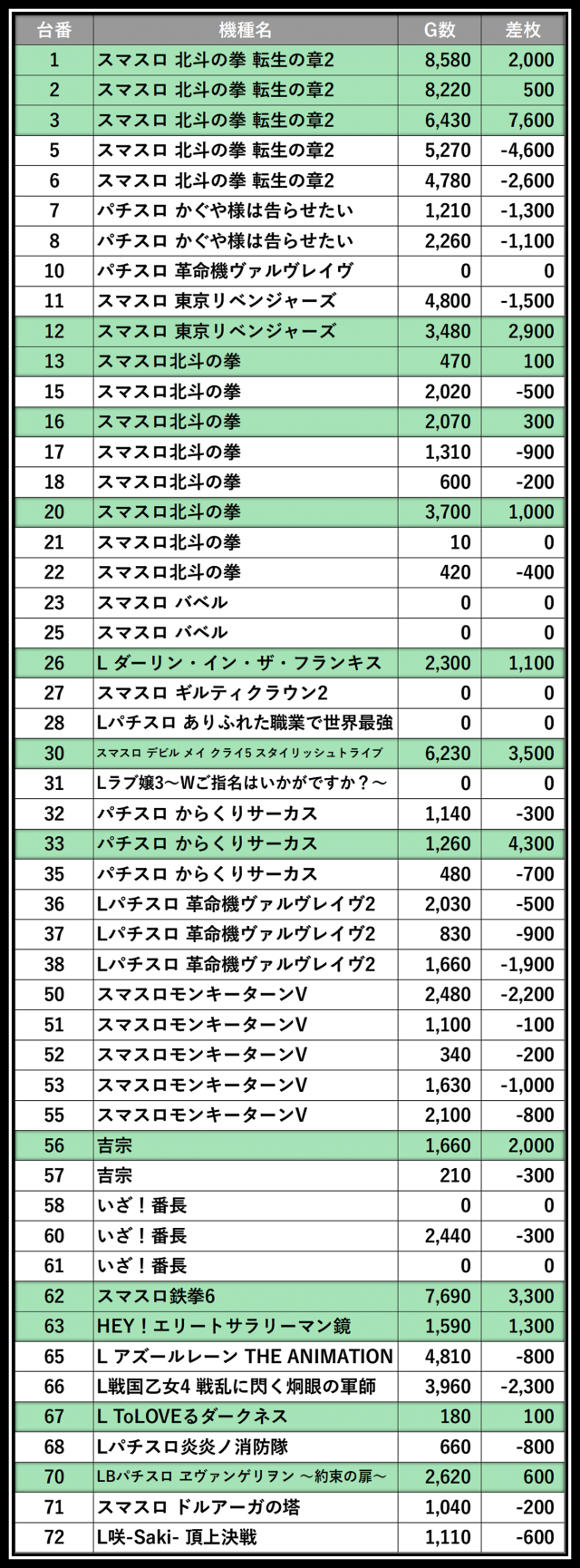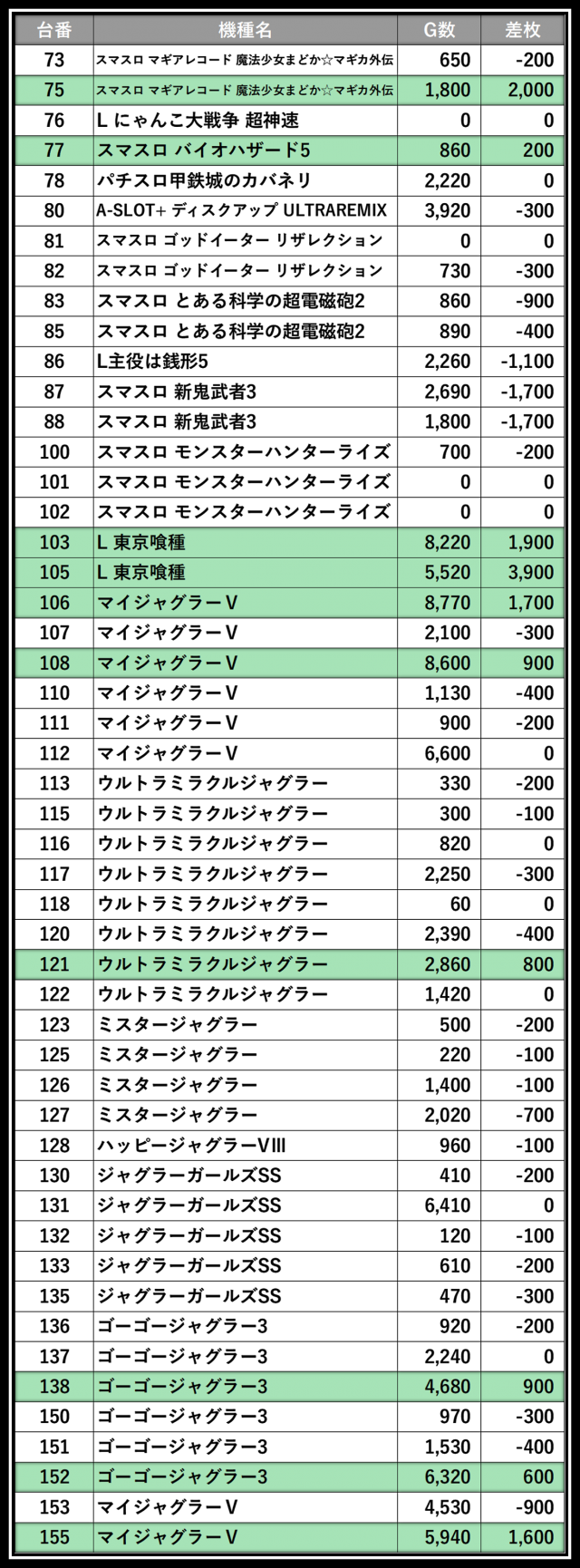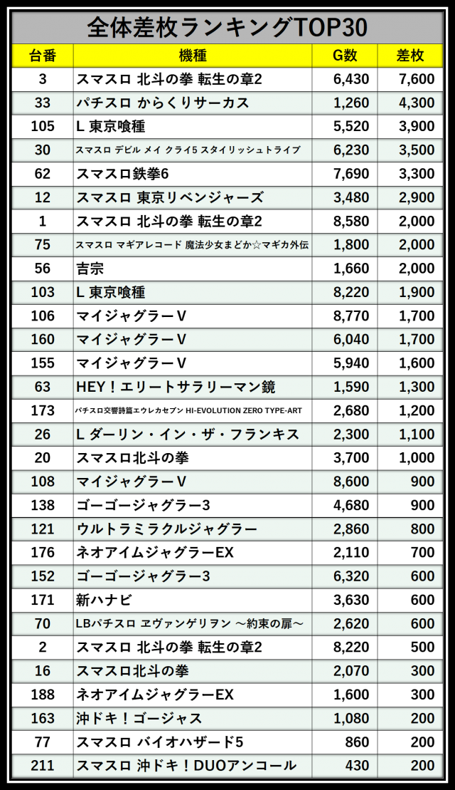 ※差枚数順に掲載しています