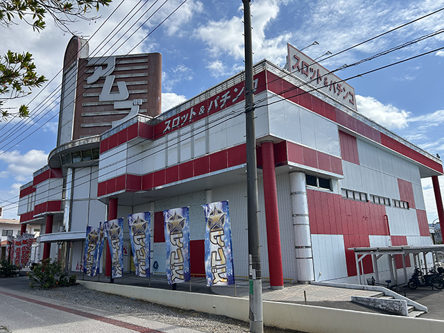 国道58号線沿いにあり、赤と白の外観も特徴的なホールだ。