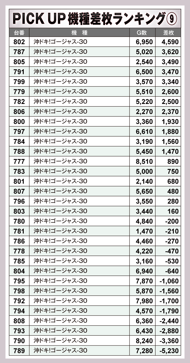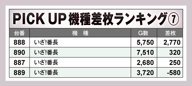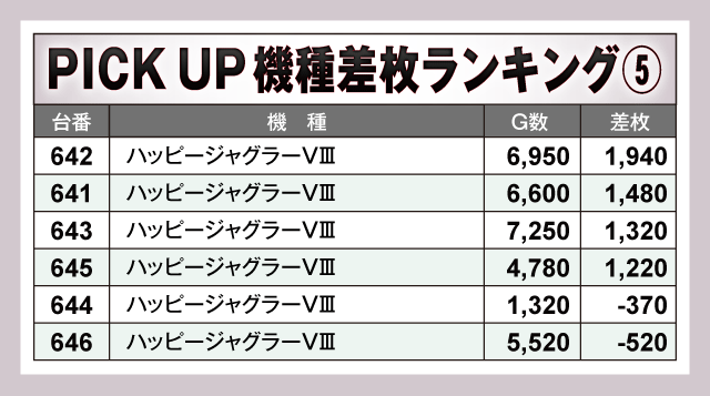 次にPICK UP機種の状況を見ていくと、差枚上位にランクインした台以外からも多数の好調台が確認されており、『吉宗』から+5,750枚、『沖ドキ!ゴージャス-30』から+4,590枚といった好成績が発生。また、ジャグラーシリーズも奮闘しており、プラス差枚で実戦を終えた台が連発しファンを喜ばせていた。