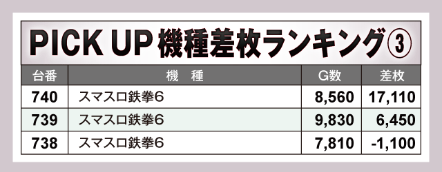 この日、最もプレイヤーの注目を集めたのが『スマスロ鉄拳6』で、740番台が怒涛の+17,110枚を叩き出しランキングトップに。次いで『L無職転生~異世界行ったら本気だす~』が+12,800枚、『Lパチスロ 革命機ヴァルヴレイヴ2』が+11,970枚を記録するなど、差枚ベスト3が実にハイレベルな結果を残し店内を盛り上げていた。