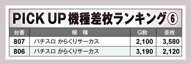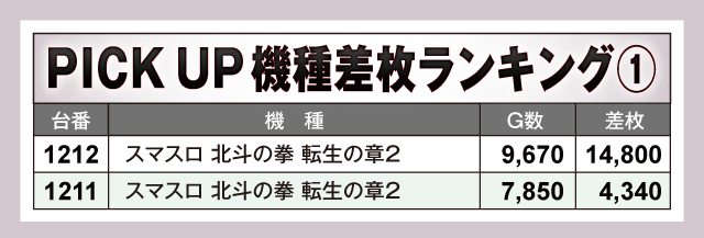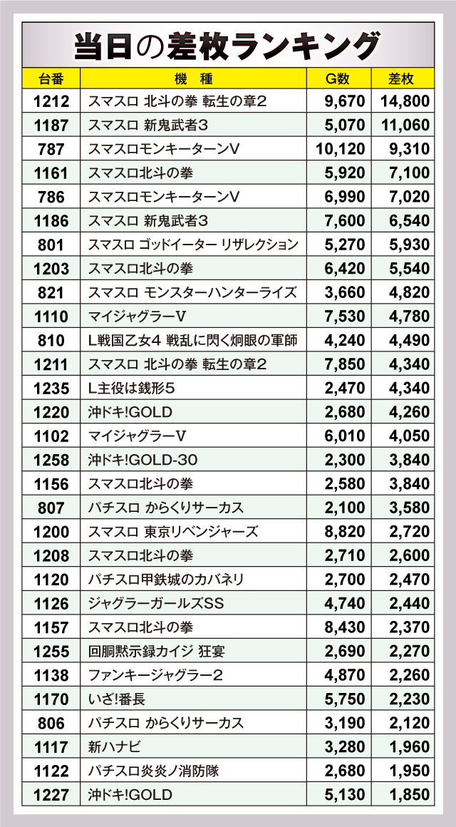 今回のPICK UP機種は全6機種で、差枚上位機種以外からも多数の好調台を確認。なかでも、『スマスロ北斗の拳』が+7,100枚を叩き出し店内を盛り上げていた。さらに、『マイジャグラーⅤ』から+4,000pt超が2台、『パチスロ からくりサーカス』は+3,580枚が発生しており、それぞれのシマは常に活気に満ち溢れる一日となった。