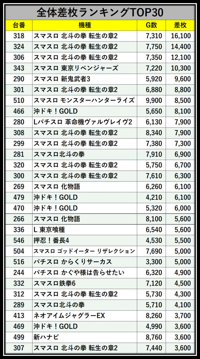 今回の「極誓取材」は、『スマスロ 北斗の拳 転生の章2』が差枚TOP3を万枚OVERで独占し、他にも7,000G超の高稼働台が複数確認できるなど、この日の中心的存在となった。また、『パチスロ かぐや様は告らせたい』では設置3台全てがプラス差枚を記録し、安定感のある存在感を発揮。加えて『スマスロ 東京リベンジャーズ』『スマスロ 新鬼武者3』『スマスロ モンスターハンターライズ』といった定番人気機種たちが軒並み高差枚を記録しており、フロア全体でスマスロの強さが際立つ一日だったと言える。一方で、『沖ドキ!GOLD』も堅実な挙動を披露。良好な合成確率を武器に、コツコツ差枚を積み上げる展開が見られ、スマスロ一強に偏らないバランスの良さも好印象だ。次回も同等以上の内容に期待必至と言わずにはいられないため、引き続き同店の動向や情報を随一チェックしておくことをオススメするぞ!