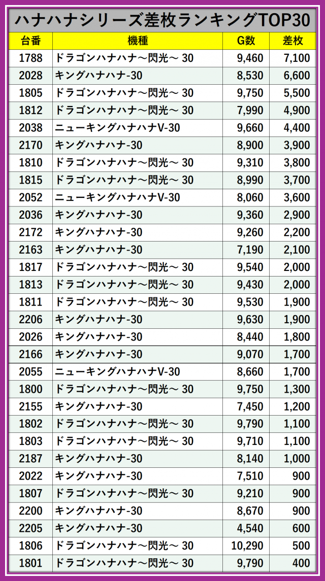 ハナハナAタイプ差枚ランキング