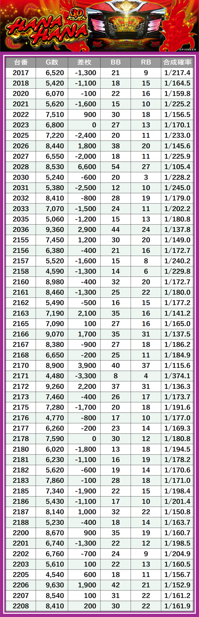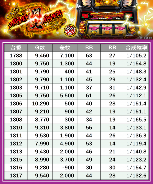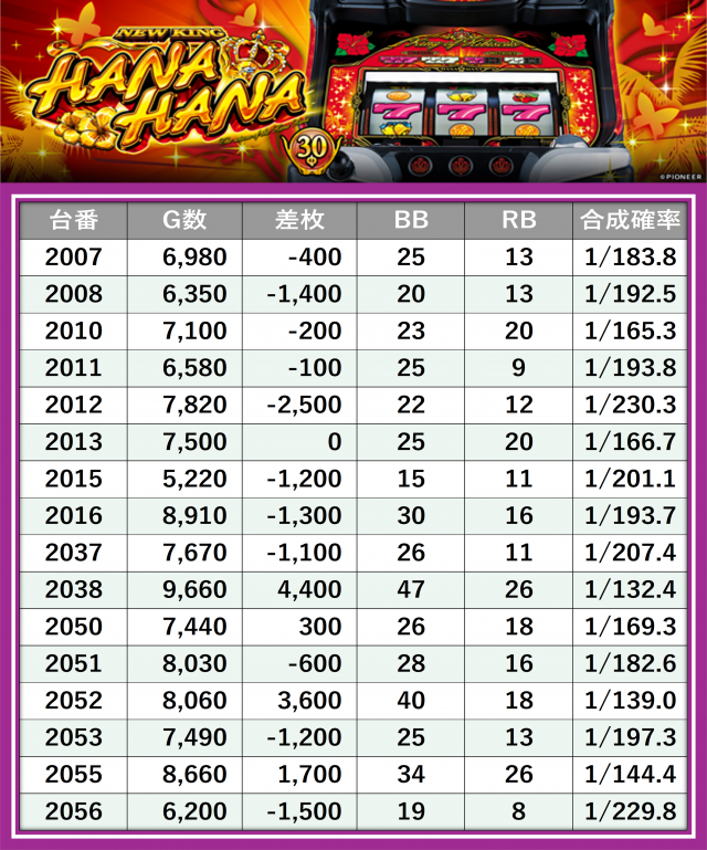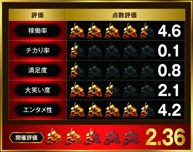 独自入手した結果データの中から、DMMぱちタウンが定める新たな基準により、同店のハナハナシリーズを評価・点数化!