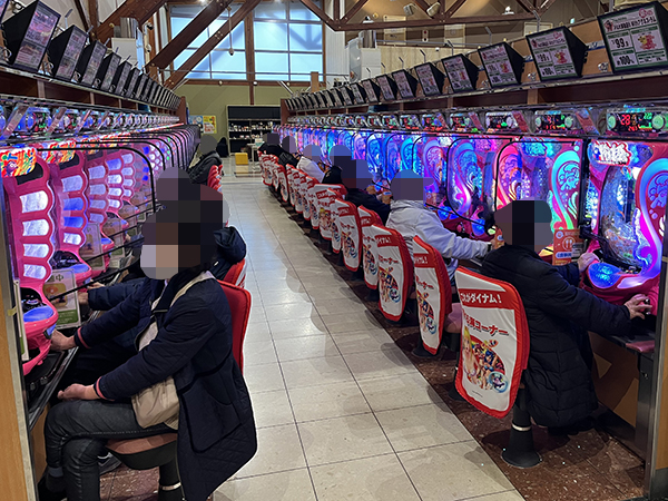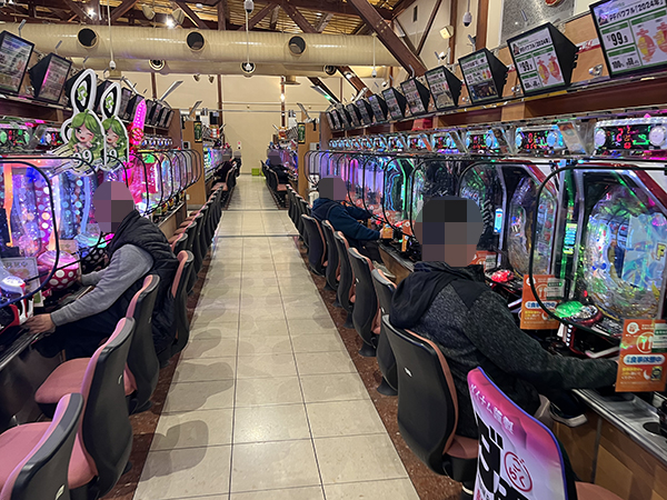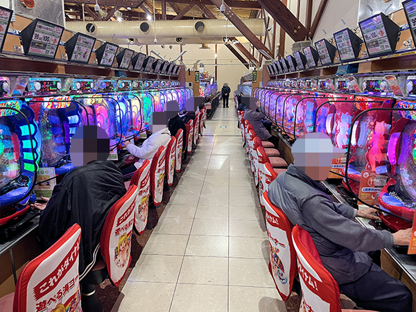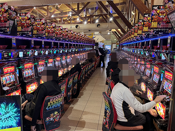取材時は多くのプレイヤーが来店。パチンコ・パチスロともに、様々な機種が支持を得ていた。