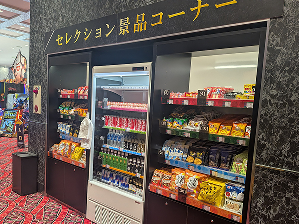 景品コーナーにはドリンク類やお菓子など多彩なアイテムが並んでおり、プレイヤーたちの興味を引いていた。