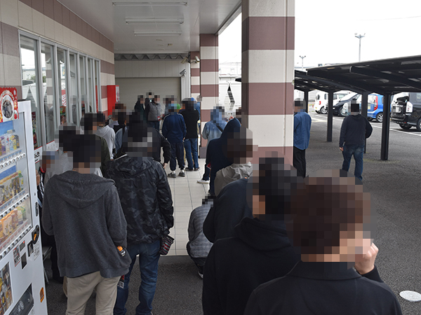 開店前から70名ほどのプレイヤーが集結。各人、これからの遊技に期待感を膨らませながら列を形成していった。