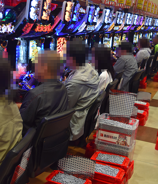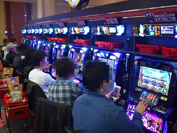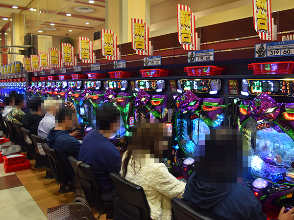 14時ごろの4円パチンコを見てみると、「CRスーパー海物語IN JAPAN 319バージョン」を筆頭に海物語シリーズが活況。機種の性能を上手く引き出すプレイヤーの姿があり、華やかな光景が広がっていた。