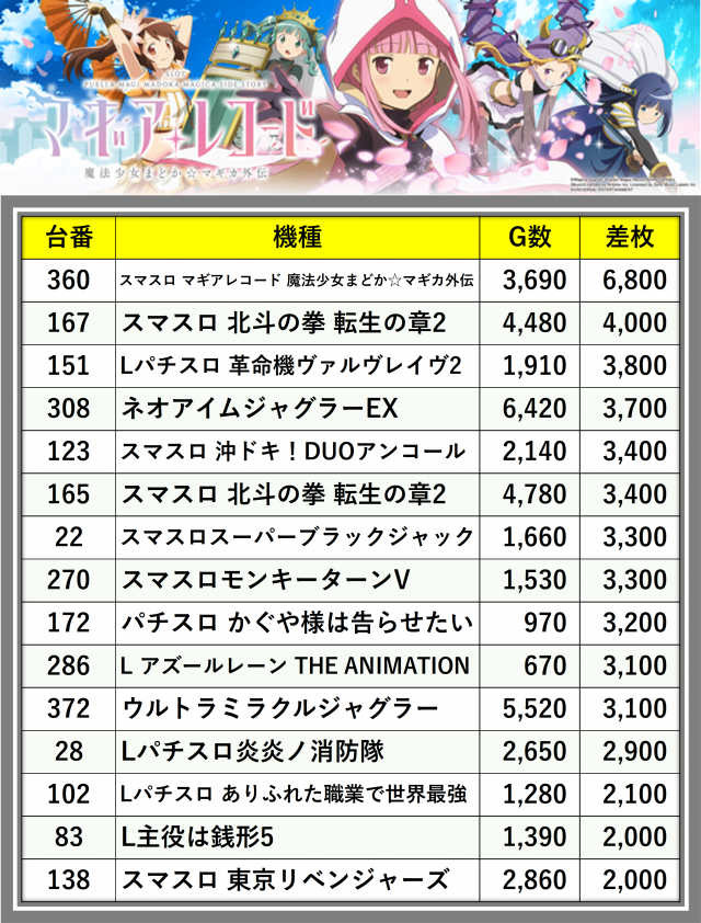 ※差枚数順に掲載しています