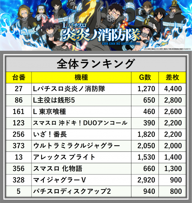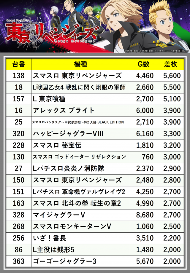 ※差枚数順に掲載しています