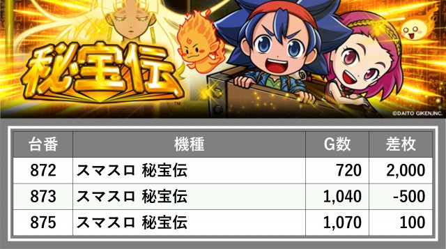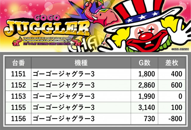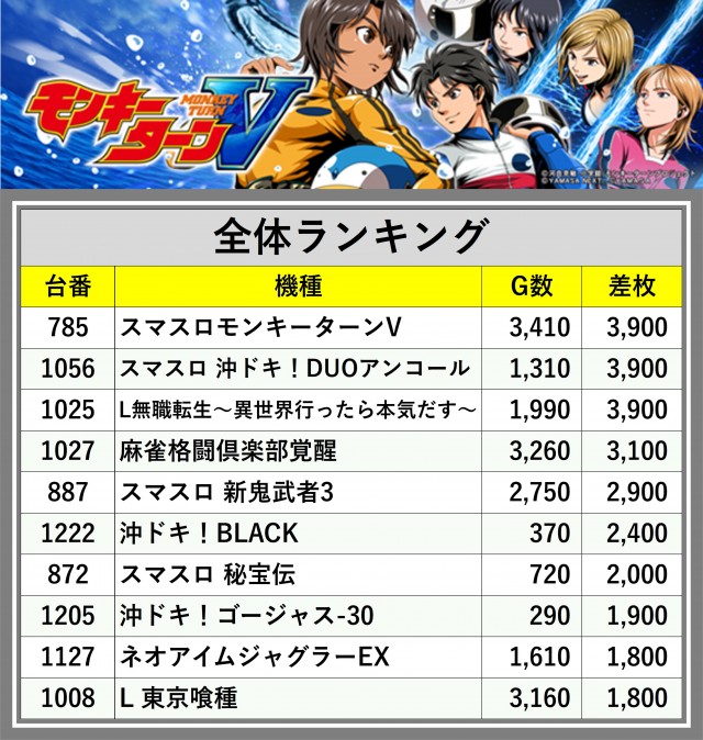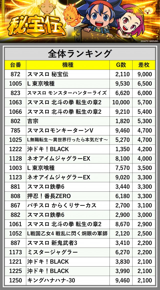 厳選された取材対象機種をはじめ、その他スロット全体から好記録が飛び出した!プレイヤーが楽しんだ1日を下記データにて振り返ってみて欲しい。