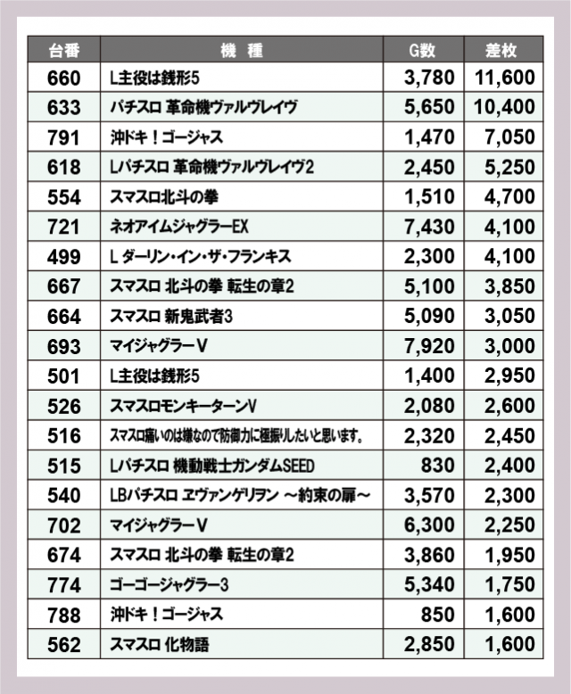 ※差枚数順に掲載しています