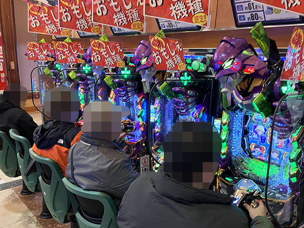 15時半ごろの4円パチンコでは、「e 東京喰種」や「e 新世紀エヴァンゲリオン 〜はじまりの記憶〜」などでプレイヤーが華麗なパフォーマンスを披露。微笑ましいシーンを随所で目にしている。