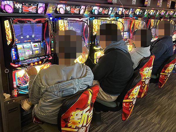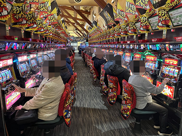 取材時は多くのプレイヤーが来店。パチンコ・パチスロともに、様々な機種が支持を得ていた。