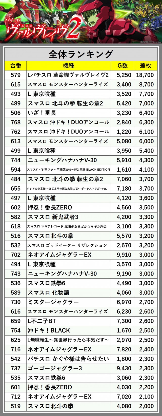 厳選された取材対象機種をはじめ、その他スロット全体から好記録が飛び出した!プレイヤーが楽しんだ1日を下記データにて振り返ってみて欲しい。