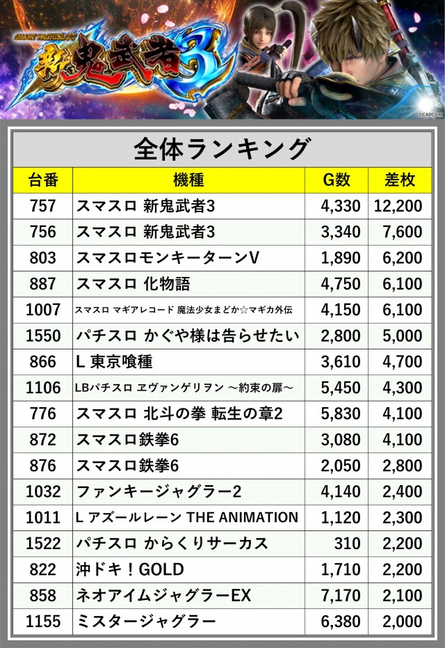 厳選された取材対象機種をはじめ、その他スロット全体から好記録が飛び出した!プレイヤーが楽しんだ1日を下記データにて振り返ってみて欲しい。